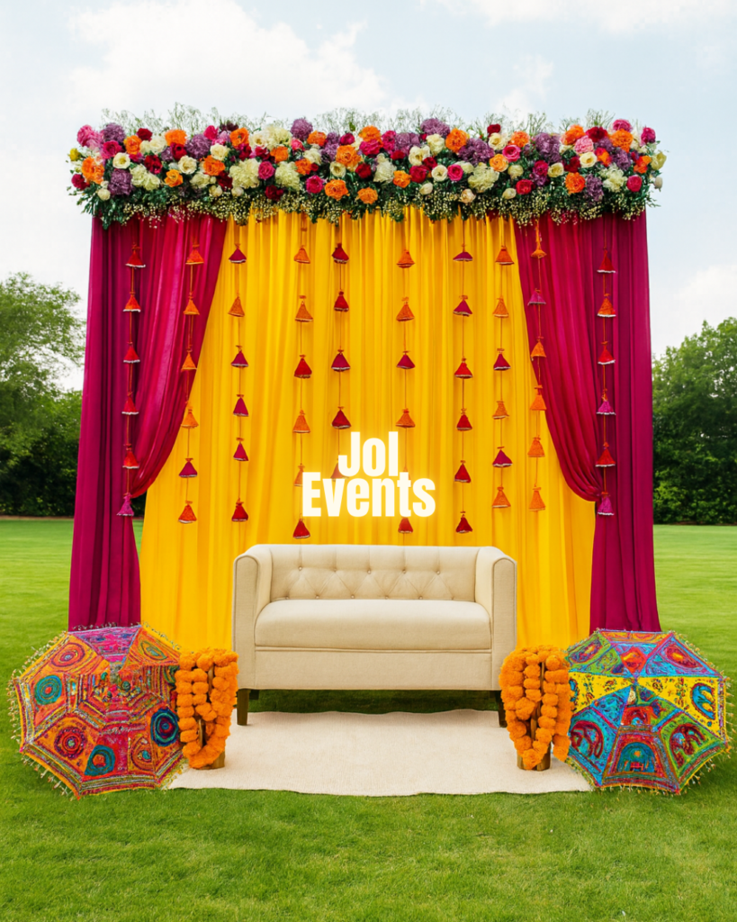 At JOL Events, we create stylish Mehndi setups with floral themes, colorful décor, lounge seating, stage styling, and photogenic backdrops that make your event visually stunning and celebration-ready.