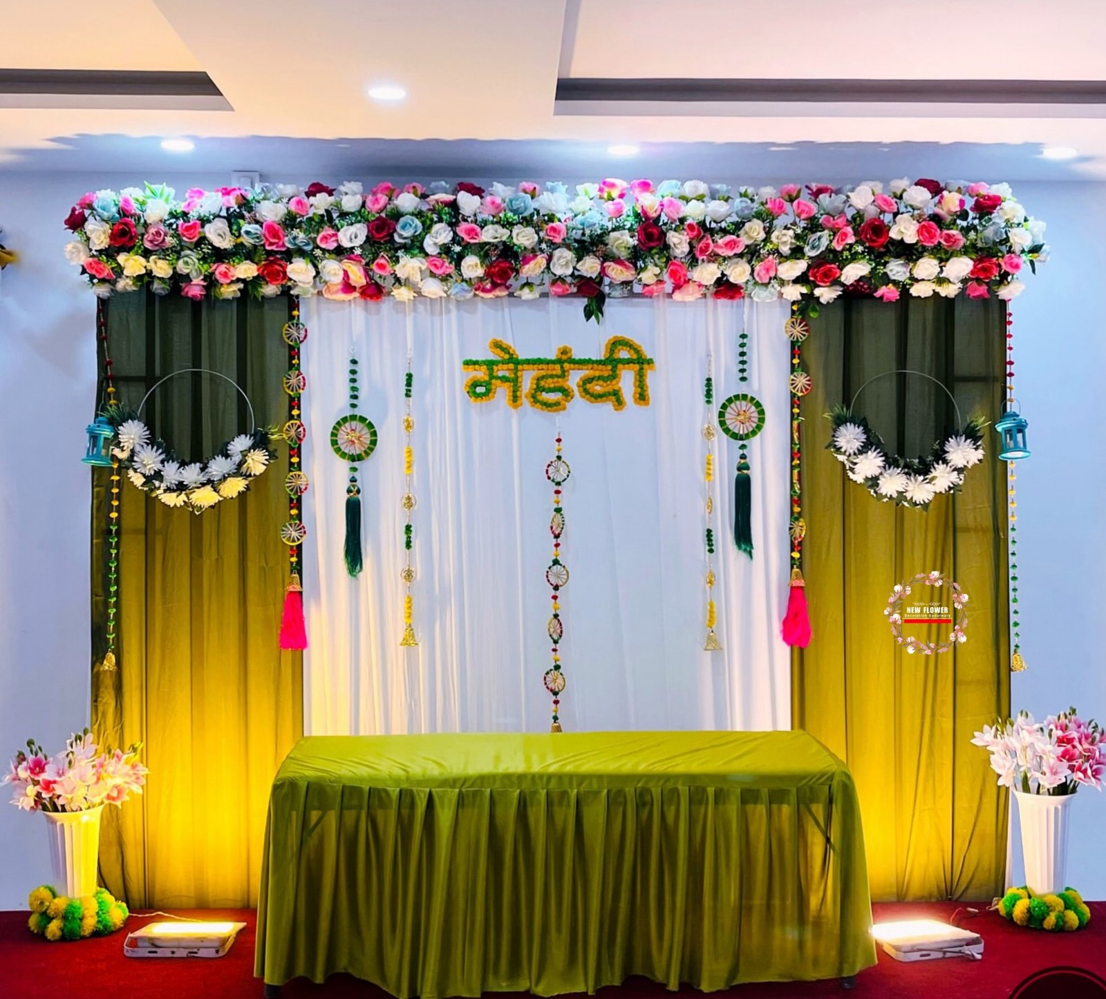 Fresh flowers bring beauty and fragrance to every celebration. Our floral mehndi decoration in Pune includes flower walls, floral garlands, hanging chandeliers, and custom floral installations.
